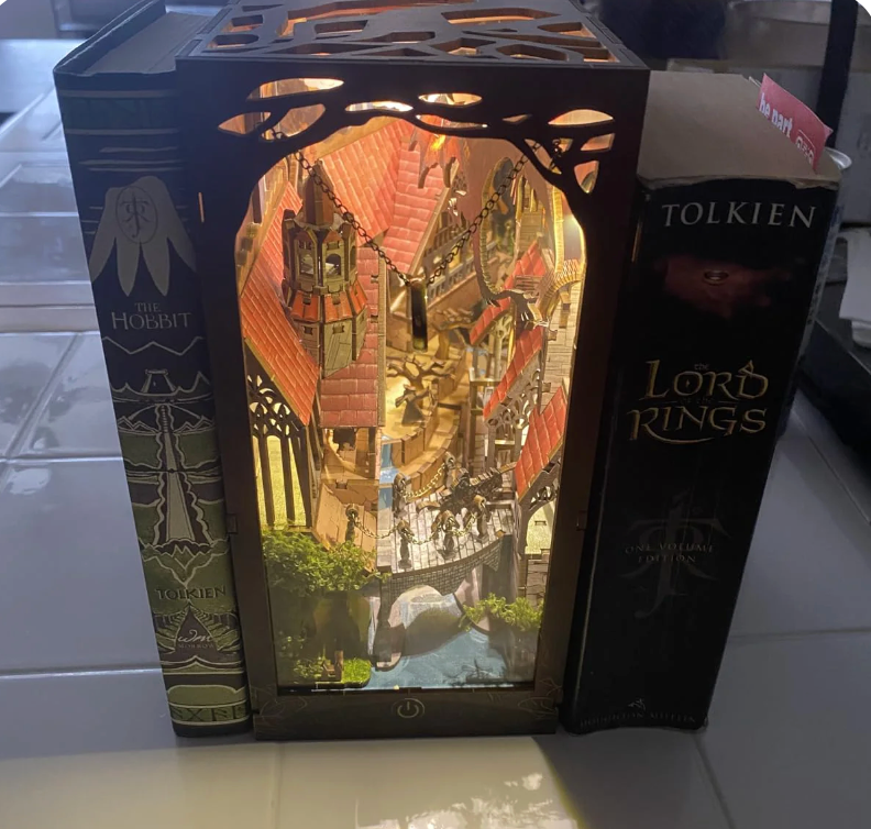 Gandalf, hidden easter eggs, tiny props, and layered details bring this book nook to life. It feels like a real window into Middle-earth sitting on your shelf.