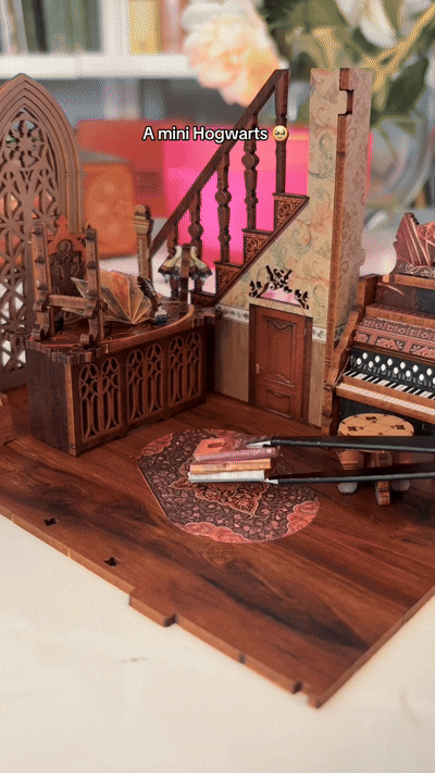 Hidden spells, floating details, tiny potions, and layered props bring this book nook to life. It feels like peeking through a secret doorway into the wizarding world, tucked perfectly between your favorite books.